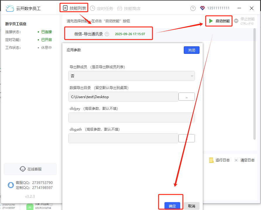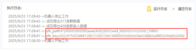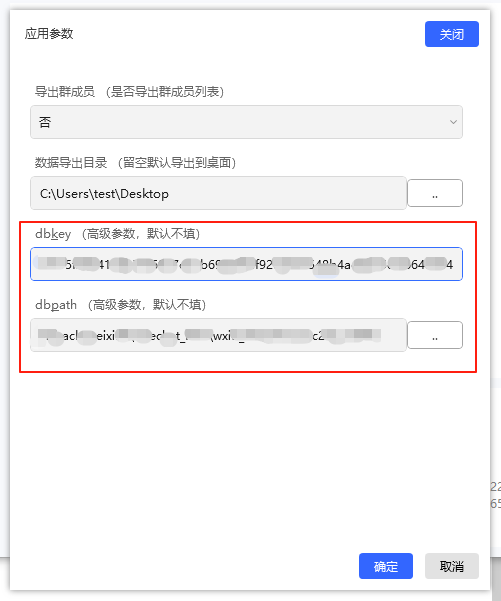 1.6 重要!!如需使用微信4最新版导出通讯录,您需要在使用上述4.0.3.22版本导出时记录 db_key ,db_path。后续升级微信到最新版后,在《微信-通讯录导出》技能里将记录的db_key和db_path填入应用参数里即可(如下图)(换电脑需重新获取 DBKey 和DBPath)