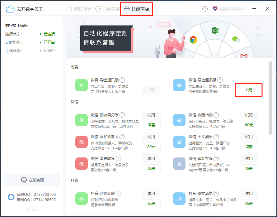 1.3 登录 数字员工软件,进入《技能商店》 免费获取《微信-通讯录导出》 技能